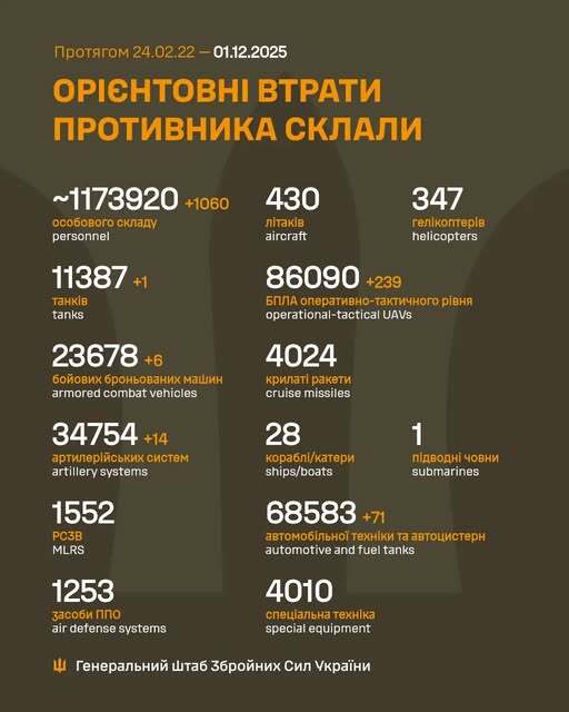 Оперативна інформація станом на 08:00 01.12.2025 щодо російського вторгнення