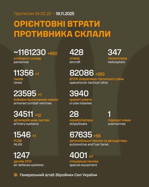 Загалом минулої доби втрати російських загарбників становили 850 осіб. Також ворог втратив танк, бойову броньовану машину, 12 артилерійських систем, реактивну систему залпового вогню, 293 безпілотні літальні апарати оперативно-тактичного рівня, 56 одиниць автомобільної техніки та одиницю спеціальної техніки.