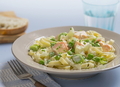 Інгредієнти:600 г філе норвезької сьомги4 порції пасти0,5 шт. цибулі-порей0,5 шт. цвітної капусти150 г замороженого зеленого горошку300 мл в