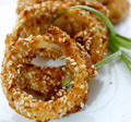 Інгредієнти:цибуля: 2 шт.борошно: 0,5 склянкирозпушувач: 1 ч. ложкаяйця: 3 шт.сухарі панірувальні: 3 ст. ложкикунжут для посипання, сіль, пе