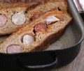 Інгредієнти:ковбаски різних сортів : 5 шт.борошно житнє: 800 гбілок: 1 шт.вода: 500 млдріжджі: 50 гцукор: 1 ст. ложкасіль за смаком 300 г.Сп