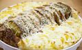 Інгредієнти:свиняча лопатка (одним шматком) - 1,3 кг,картопля - 800 г,яблука (зелені) - 3 шт.,жовтки 2 яєць,сир - для посипання,вершкове мас