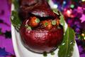 Інгредієнти:цибуля (червона) - 4 шт.,сушені абрикоси - 4 шт.,мигдаль - 50 г,родзинки - 50 г,мед - 2 ст. ложки,вершкове масло - 1 ст. ложка,о