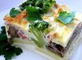 Інгредієнти:картопля - 3 шт.,броколі - 200 г,гриби - 200 г,копчений бекон - 250 г,сир - 250 г,зелень петрушки - 0,5 пучка,яйця - 4 шт.,молок