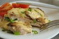 Інгредієнти:свинина - 6 шматків,шампіньйони - 6 шт.,голландський сир - 200 г,помідори - 3 шт.,майонез - 200 г,олія - для форми,сіль і чорний