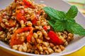 Інгредієнти:перлова крупа: 1 стакансвіжа або сушена м’ята: жменяпомідори: 3 шт.оливкова олія та сіль: за смаком Спосіб приготування:1. Відв