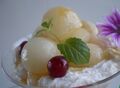 Інгредієнти:диня: 150 гсир вершковий: 150 гмолоко: 4 ст. ложкимед: 2 ч. ложкицукор: 2 ч. ложкикілька вишень та кілька листочків м’яти для оз