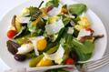 Інгредієнти:спаржа - 200 гфіле анчоусів - 6 штяйця - 2 штпомідори черрі (червоні і жовті) - 5-7 штмаслини - 10 штсуміш салатного листя - 1 у