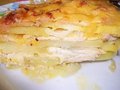 Ингредиенты:- Картошка – 600г.- Лук – 150г.- Куриное филе – 500г.- Твердый сыр – 250-300г.- Чеснок – 3-4 зубчика.- Сметана – 250-350 мл.- Ма