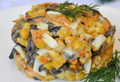Інгредієнти:гриби - 500 гяйця - 2 штцибуля - 1 штморква - 1 шткукурудза - 1 банка (350 г)сіль і чорний мелений перець - за смакоммайонез - д