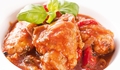 Інгредієнти:1,5 кг курки,600 г помідорів,300 г болгарського перцю,300 г цибулі,1 кисле яблуко,1 головка часнику,пучок петрушки,пучок кінзи,5