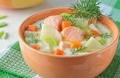 Інгредієнти:700 г філе червоної риби,500 мл вершків 20%,5 картоплин,1 цибуля порей,1 морква,3 ст. ложки олії,пучок зелені (кріп і петрушка),