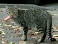 Кошка выскочила из мусорного контейнера, держа в зубах разорванную упаковку от сосисок. В ней лежало их всего три, но кошка была все равно р