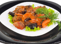 Інгредієнти:500 г свинячої м'якоті,2 селери,1 цибулина,400 г помідорів,200 г чорносливу,150 мл напівсолодкого вина (червоного або білого),2-