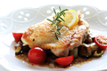 Інгредієнти:600 г курячого філе,200 г твердого сиру,300 г печериць,1 цибулина,2 помідори,невеликий пучок зелені,1 зубок часнику,50 г майонез