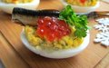 Ингредиенты:-7-8 куриных яиц;-1 баночка мелких шпрот;-50 г красной икры;-2-3 зубчика чеснока;-2-3 ст. л. майонеза;-2 веточки укропа;-соль, ч