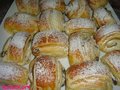Ингредиенты:Тесто слоеное дрожжевое — 500 грсахарная пудра или сахар — 3-4 ст лтворог 9 % — 400 грванилин — 1/3 ч лизюм — 0,5 стаканасметана