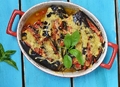 Інгредієнти:300 г курячого фаршу,4 баклажани,4 помідори,1 цибулина,2 зубки часнику,200 г печериць,кілька гілочок зелені (базилік, кріп),2 ст