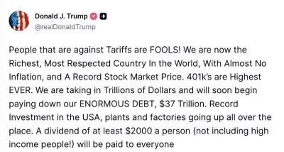 Отже, Трамп пообіцяв заплатити всім американцям по дві тисячі доларів "дивідендів" за рахунок мит, які США стягують із товарів інших країн. Ну, це ще велике питання, чи ця дурка з тарифами не зашкодить економіці США та не знизить доходи, замість їх підвищити.